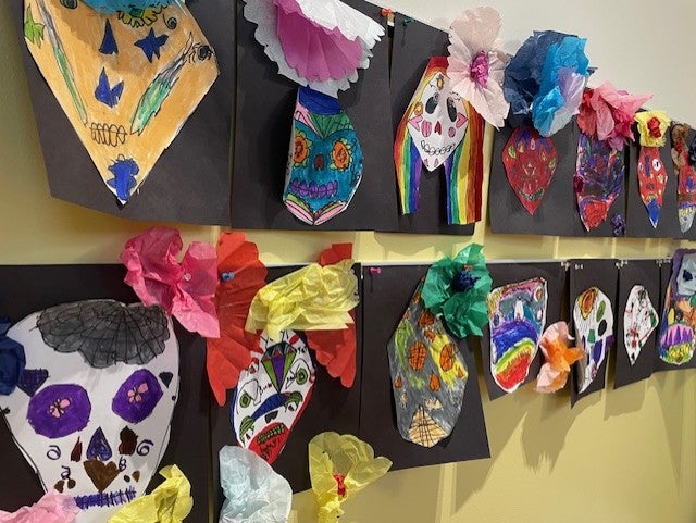 As part of Hispanic Heritage month, students learned about Dia De Los Muertos and Mexican Sugar Skulls. Then students created their own symmetrical skull art.