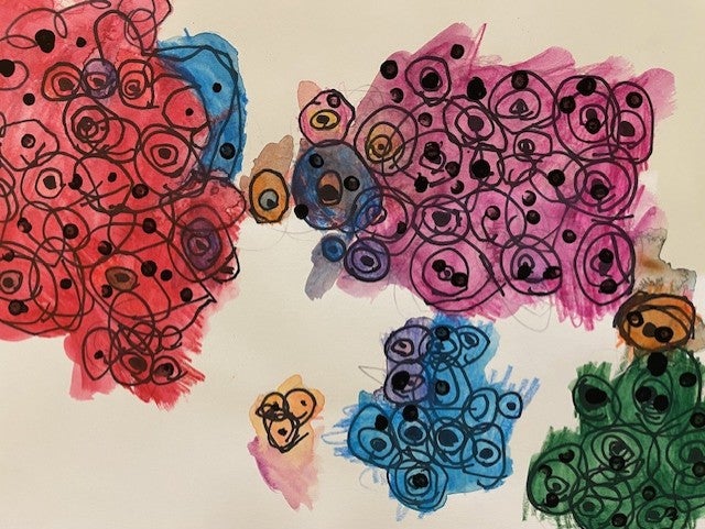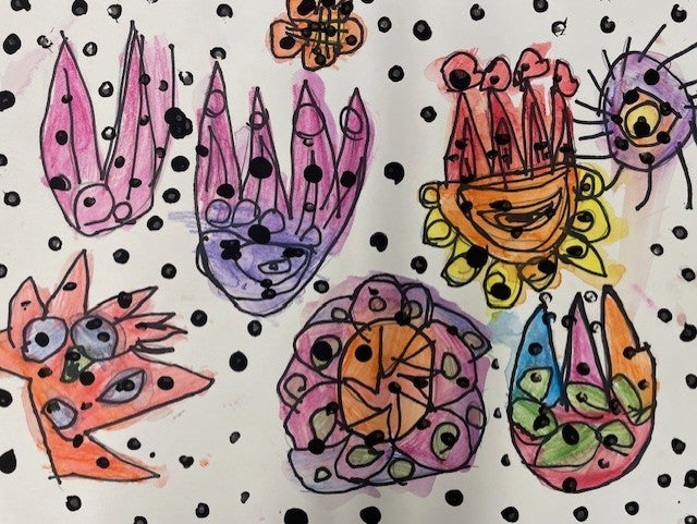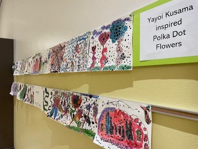 Students studied mentor artist Yayoi Kusama. Using water color pencils, Q-tips and Tempera paint, students created their own flowers.